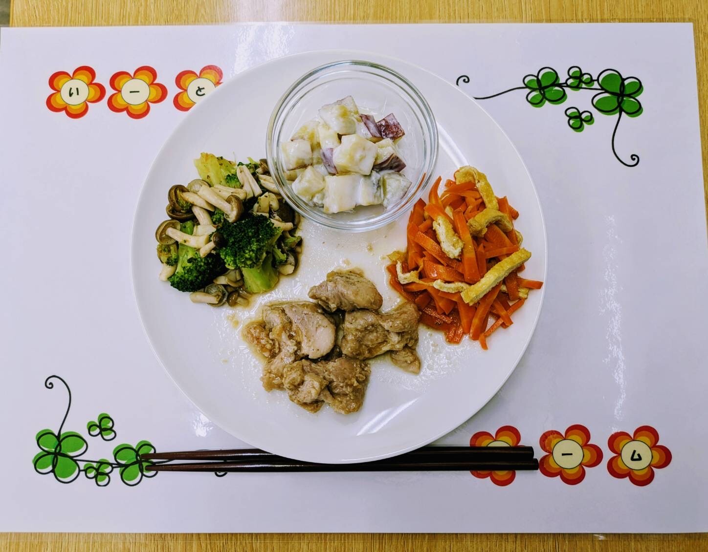 「鶏肉のごましょうゆ きんぴら ブロッコリーのおかか和え さつまいものヨーグルトサラダ」